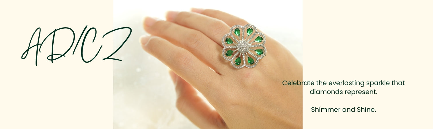CKLAKART's NOOR Elegant Silver Ring Featuring Emerald Green Rectangular Stone and American Diamonds