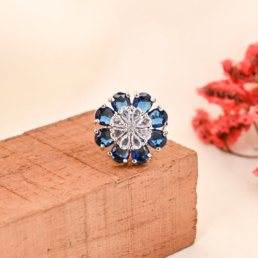 CKLAKART's NOOR Silver-Toned Ring Adorned with Sapphire Blue Stones and Dazzling American Diamonds