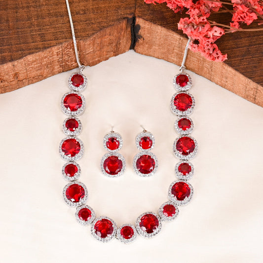 CKLAKART's NOOR Classic Silver-Toned Necklace Set with Ruby Red Stones and Sophisticated American Diamonds