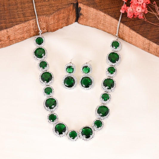 CKLAKART's NOOR Silver-Toned Necklace Set Adorned with Emerald Green Stones and Dazzling American Diamonds