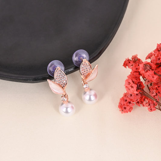 CKLAKART's Rose Gold-Toned Leaf Studs Featuring AD Stones and Delicate Pearl Drop