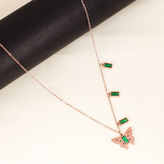 CKLAKART's Rose Gold Butterfly Pendant Necklace with Green Stone Accent