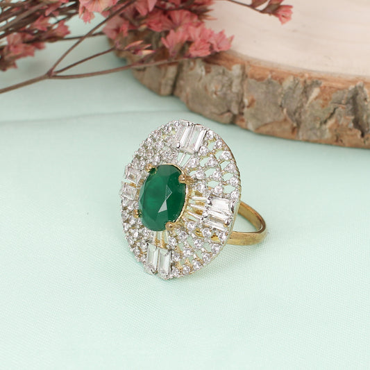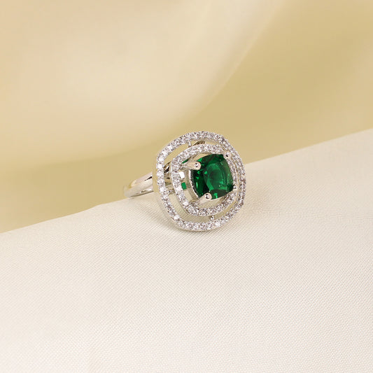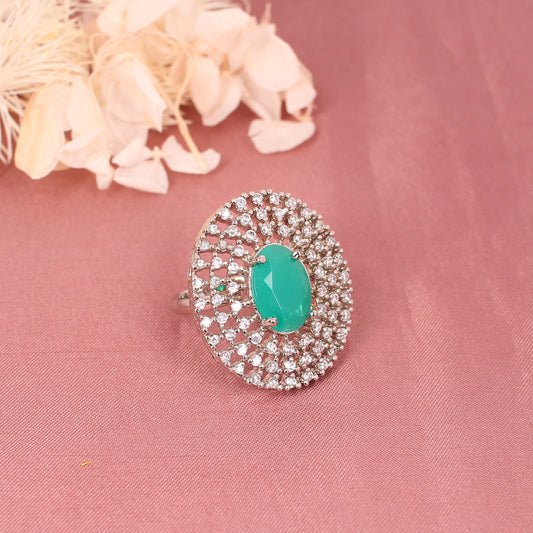 CKLAKART's Silver-Toned Big Ring with Oval Emerald Green and Surrounding White Stones