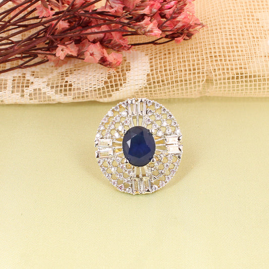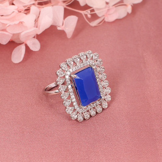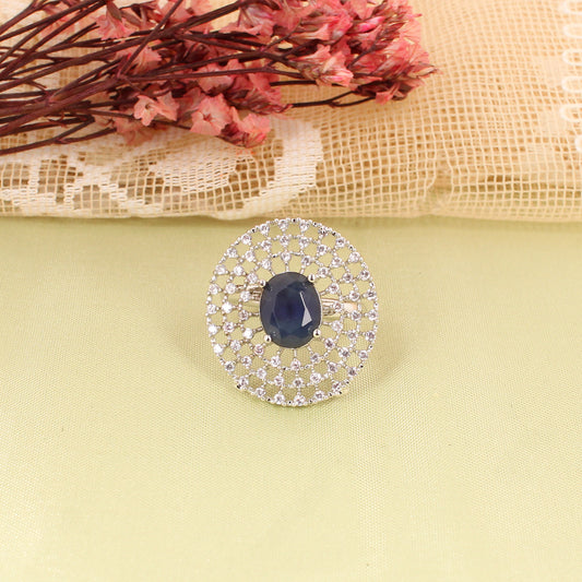 CKLAKART's Silver-Toned Statement Ring with Blue Sapphire Center and White Stone Embellishments