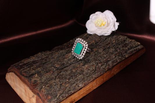 CKLAKART's Silver-Toned Statement Ring with Emerald Green Center and White Stone Embellishments
