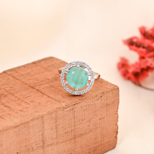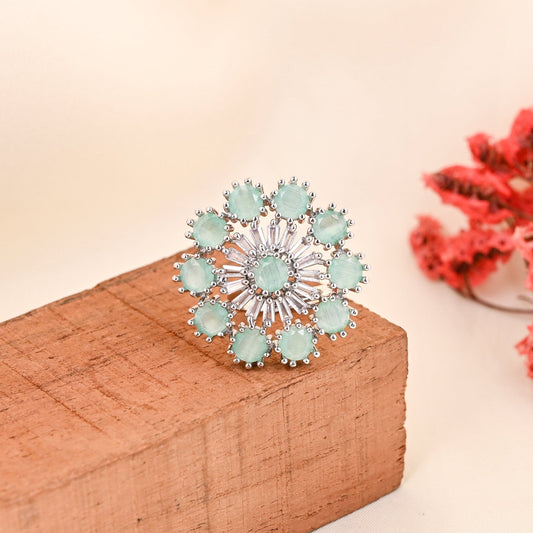 CKLAKART's NOOR Silver Big Ring Featuring Aquamarine Stones and Sparkling American Diamonds