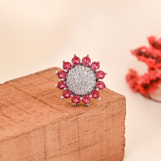 CKLAKART's NOOR Silver Big Ring Featuring Ruby Red Stones and Sparkling American Diamonds