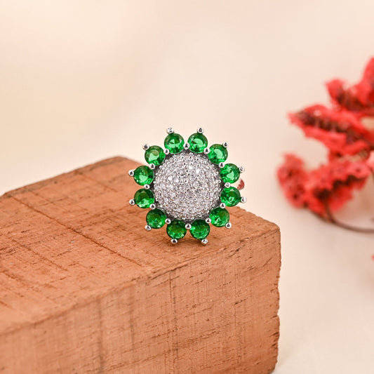 CKLAKART's NOOR Silver Big Ring Featuring Emerald Green Stones and Sparkling American Diamonds