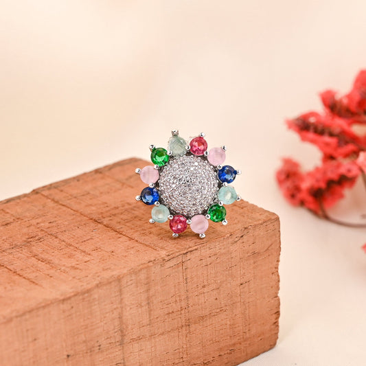 CKLAKART's NOOR Silver Big Ring Featuring Multi Color Stones and Sparkling American Diamonds