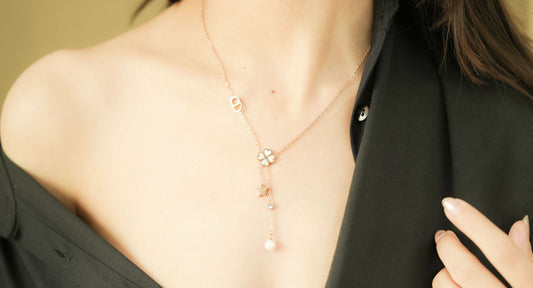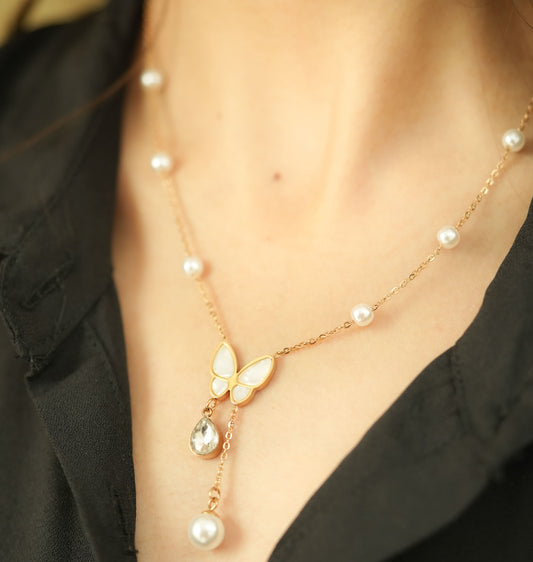 CKLAKART's Rose Gold Butterfly Pendant with Pearl Beaded Chain and Droplets
